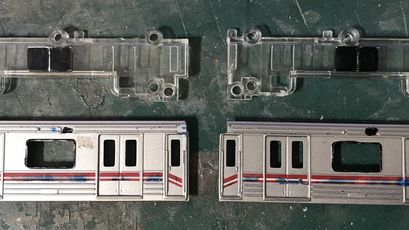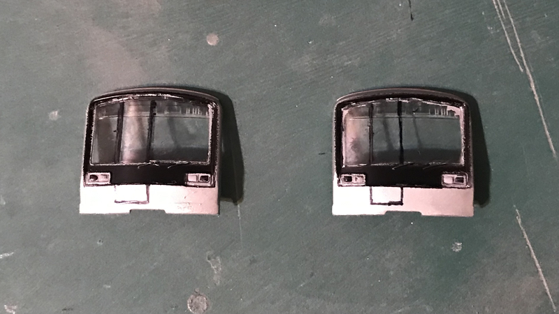 続いてGM鉄道カラー黒で、窓周りのブラックフェイス部分も再現します。窓とライトケースにマスキングテープをがんばって貼り付けます。