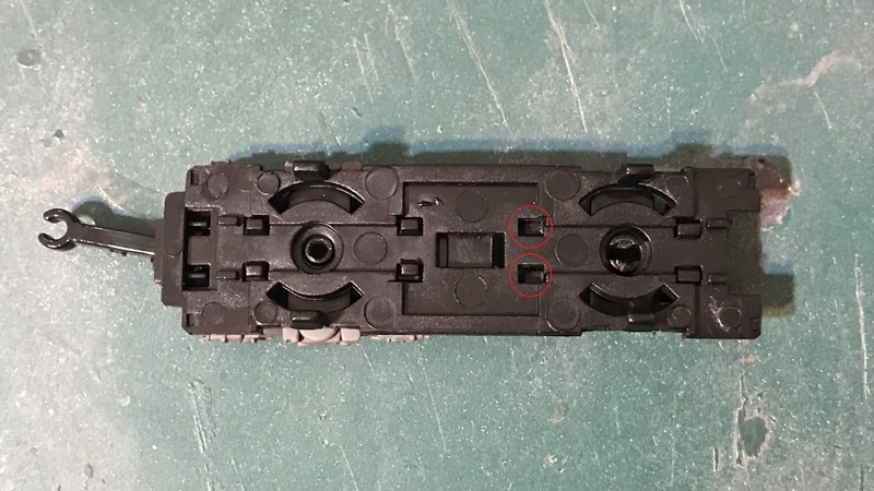 New HGシャーシの床板は片方の先端を写真のようにカットし、カプラー受け付きブロックがはまるようにします。